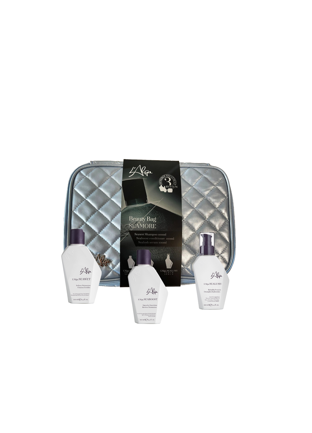 L’Alga Seawet Shampoo 100ml + L’Alga Seaboost Conditioner 100ml + L’Alga Sealush Serum 100ml + Light Blue Beauty Bag